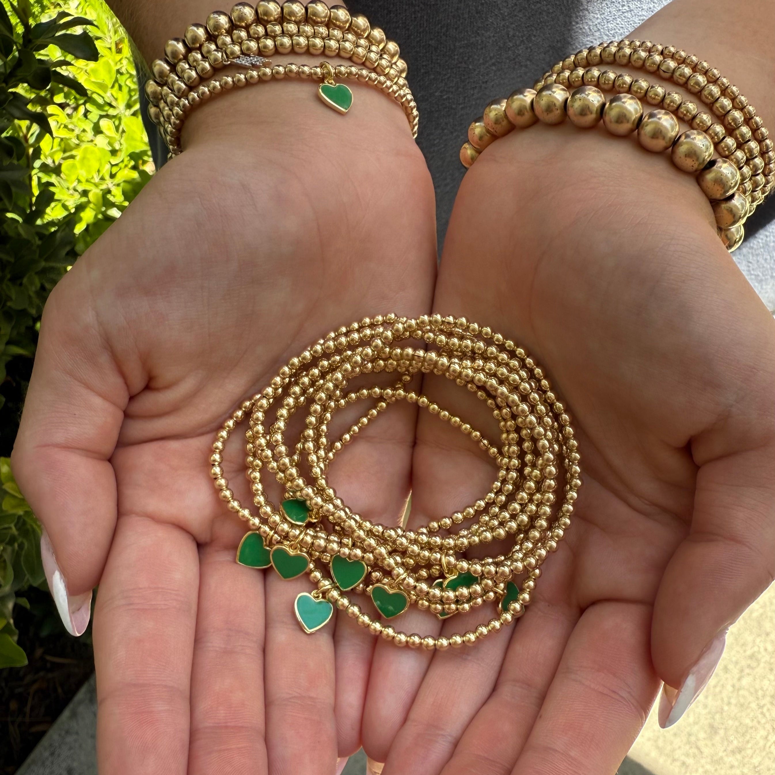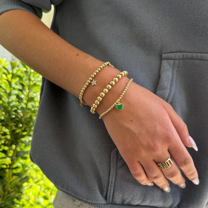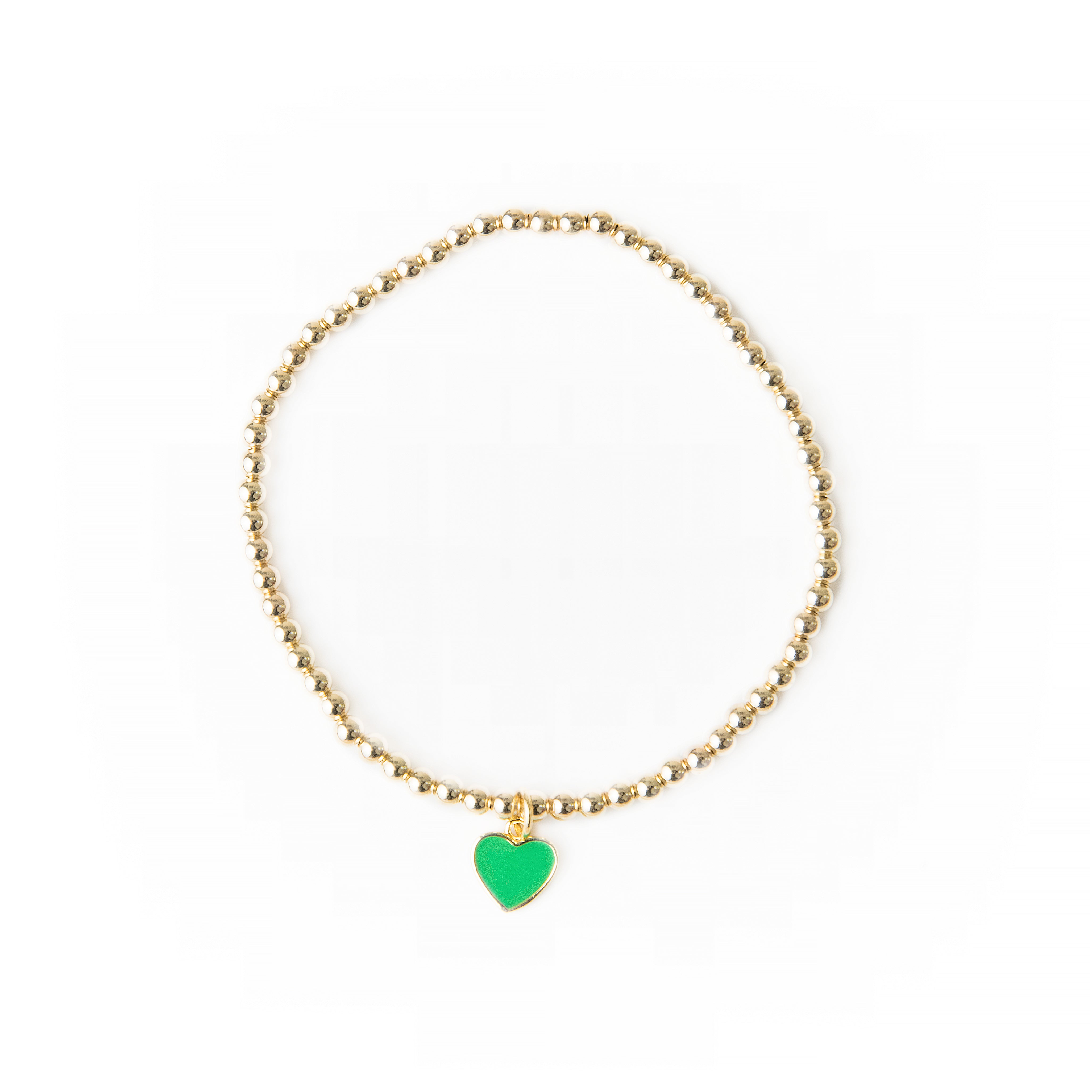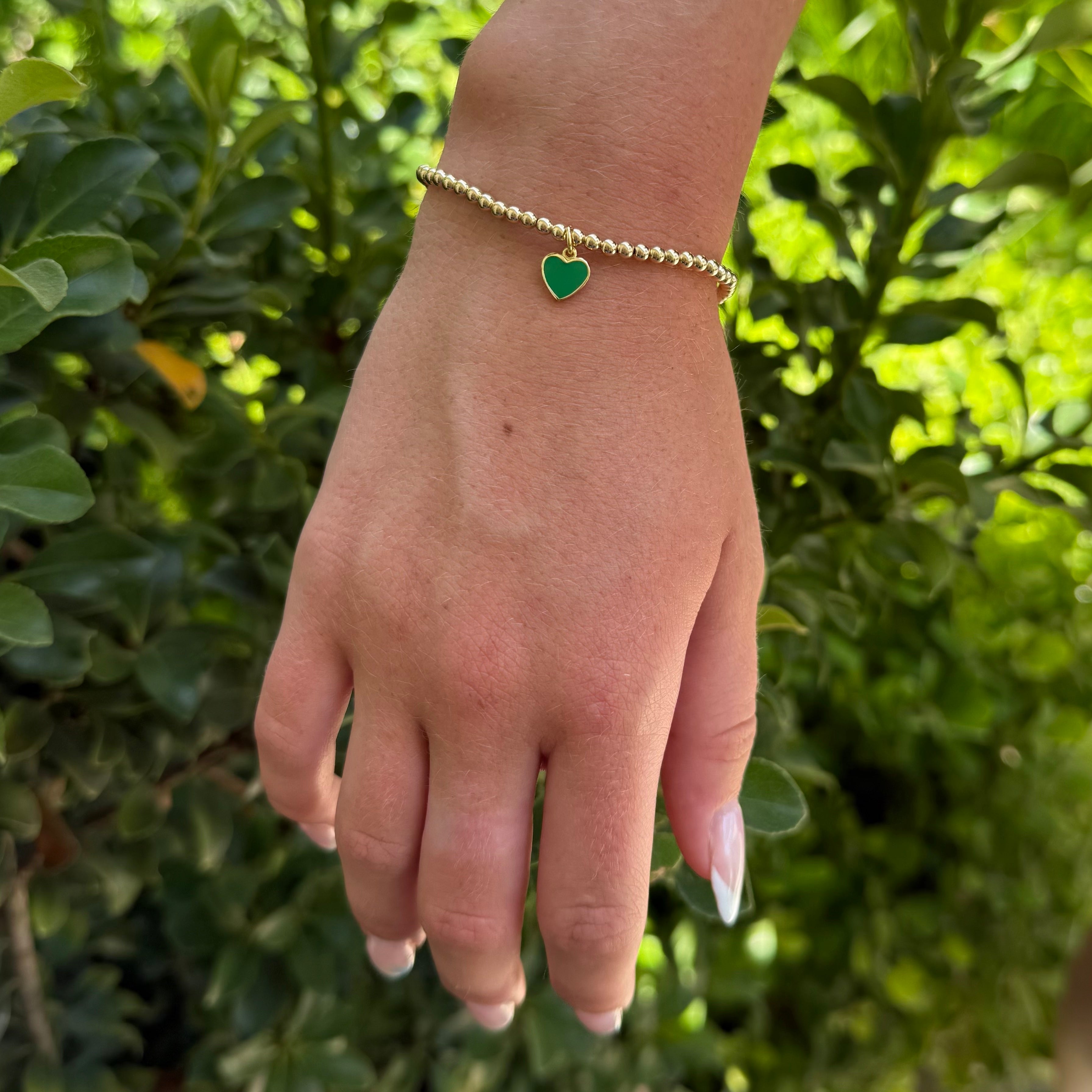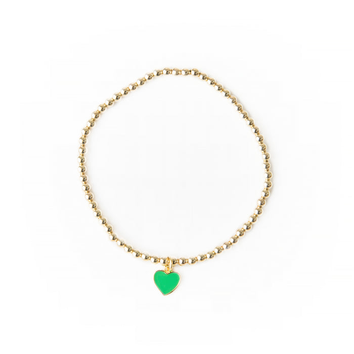 The bracelet features a 14k gold-plated green enamel heart charm dangling from a 14k gold-filled 3mm bead bracelet.