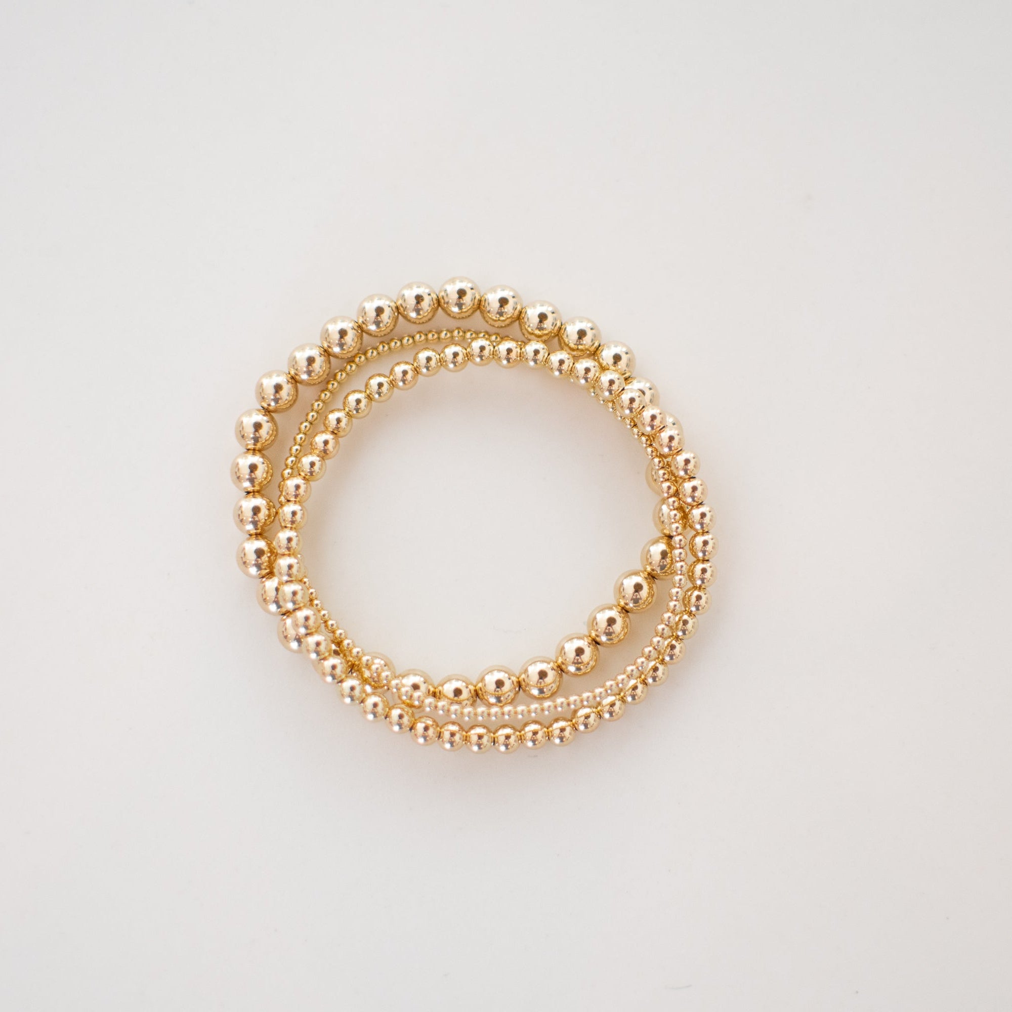 A trio of bracelets balancing our tiniest bead size with a small and a medium, including our 14k gold-filled 2mm, 4mm and 6mm bead bracelets.